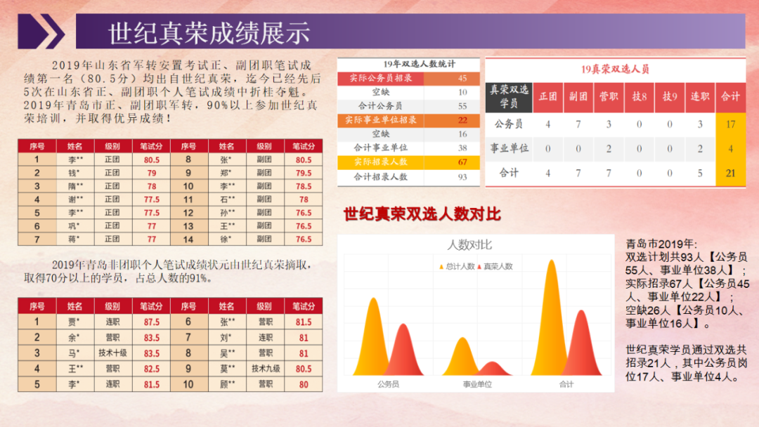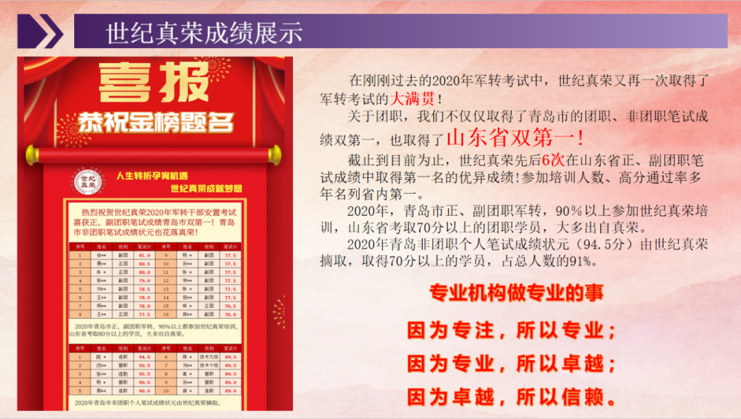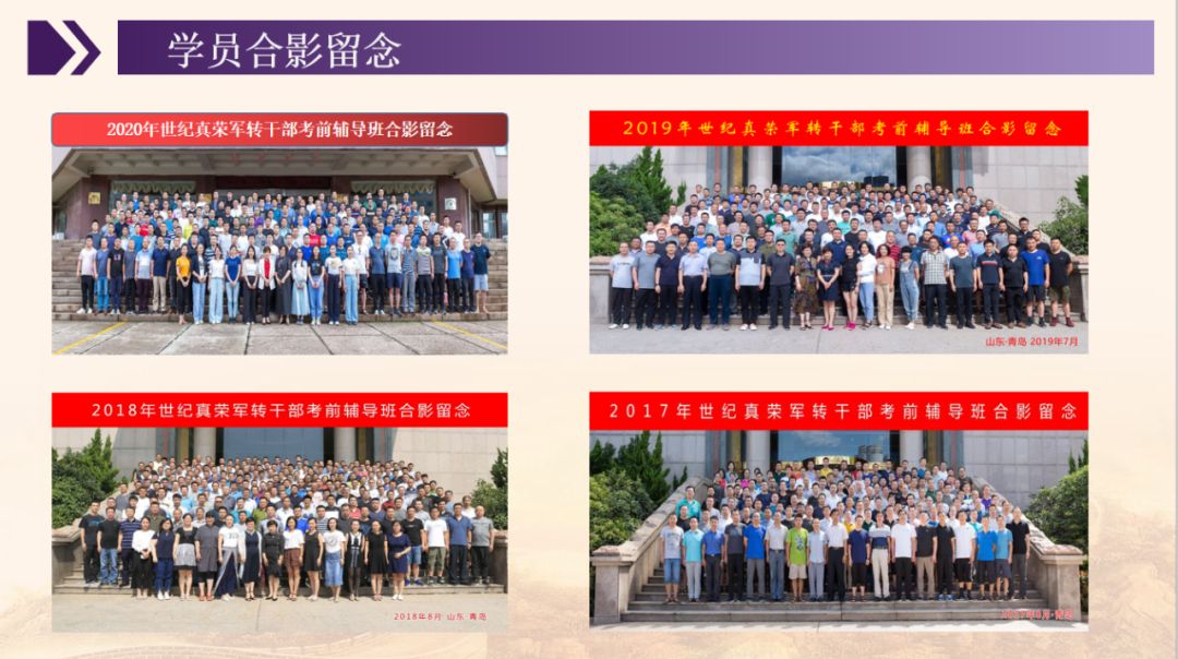 人生轉折孕育機遇,世紀真榮成就夢想。世紀真榮全體教職員工熱忱期盼并誠摯歡迎廣大軍轉干部蒞臨學習備“戰”,我們將以更高的課程質量,更優質的服務體系助各位領導夢想成真。