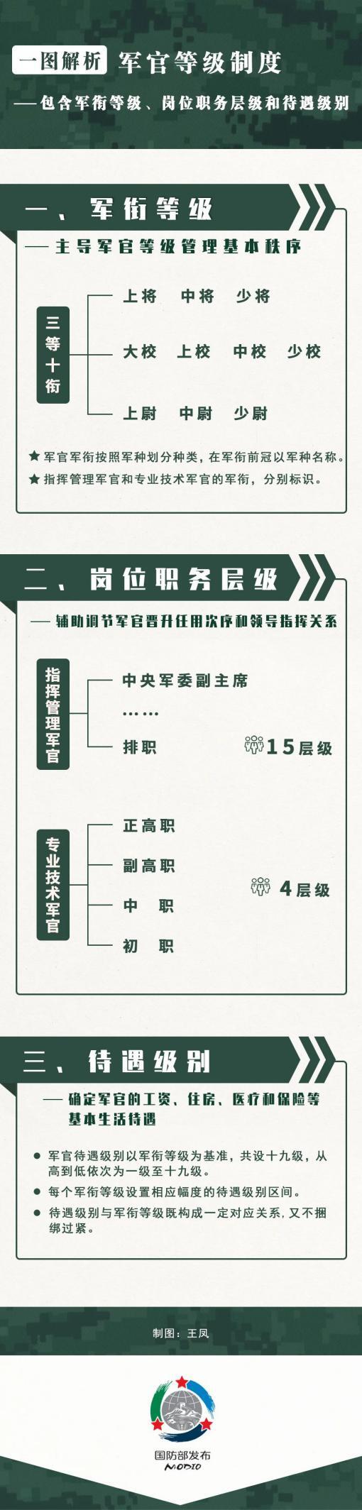 吳謙:新的軍官制度對軍官等級設置作出重大改革,由基于職務等級調整為基于軍銜等級。新的軍官軍銜設“三等十銜”,將官分為上將、中將、少將,校官分為大校、上校、中校、少校,尉官分為上尉、中尉、少尉。軍官軍銜按照軍種劃分種類,在軍銜前冠以軍種名稱。指揮管理軍官和專業技術軍官的軍銜,分別標識。
