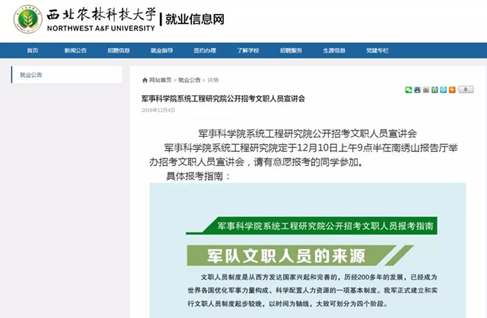 在昨天西北農林科技大學就業信息網中發布了《軍事科學院系統工程研究院公開招考文職人員宣講會》