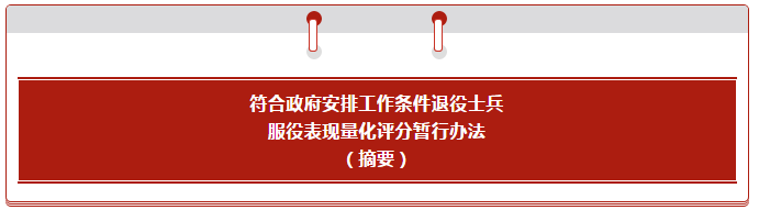 (三)本辦法所指退役士兵服役表現量化評分,是指根據退役士兵服役期間參加作戰表現、練兵備戰水平、服役年限、服役地區艱苦程度及相關身份等,按照統一標準予以賦分。退役士兵得分總和作為政府安排工作的主要依據。