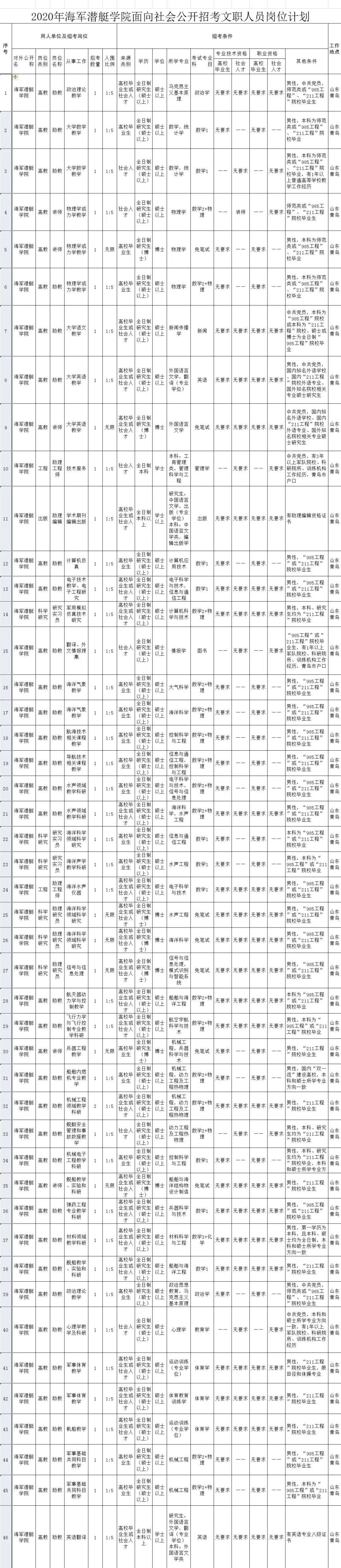 今年學院面向社會公開招考共設置了40多個崗位,涵蓋馬克思主義理論、心理學、體育學、中國語言文學、外國語言文學、新聞傳播學、數學、物理學、大氣科學、機械工程、動力工程及工程熱物理、信息與通信工程、控制科學與工程、船舶與海洋工程、兵器科學與技術等專業門類,具體崗位信息以軍隊人才網發布內容為準。